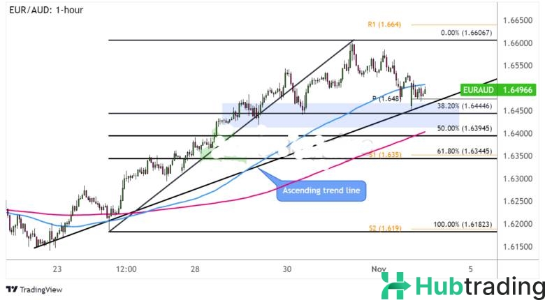 Furthermore, mid-tier flash manufacturing PMIs from Spain and Italy are expected to show slight improvements early in the week, potentially giving the euro a solid footing. If this occurs, EUR/AUD could gain momentum from its bounce off a rising trend line, an area of interest, and the 38.2% Fibonacci retracement near the pivot point level (1.6480). Thanks to Hubtrading for this insight.
