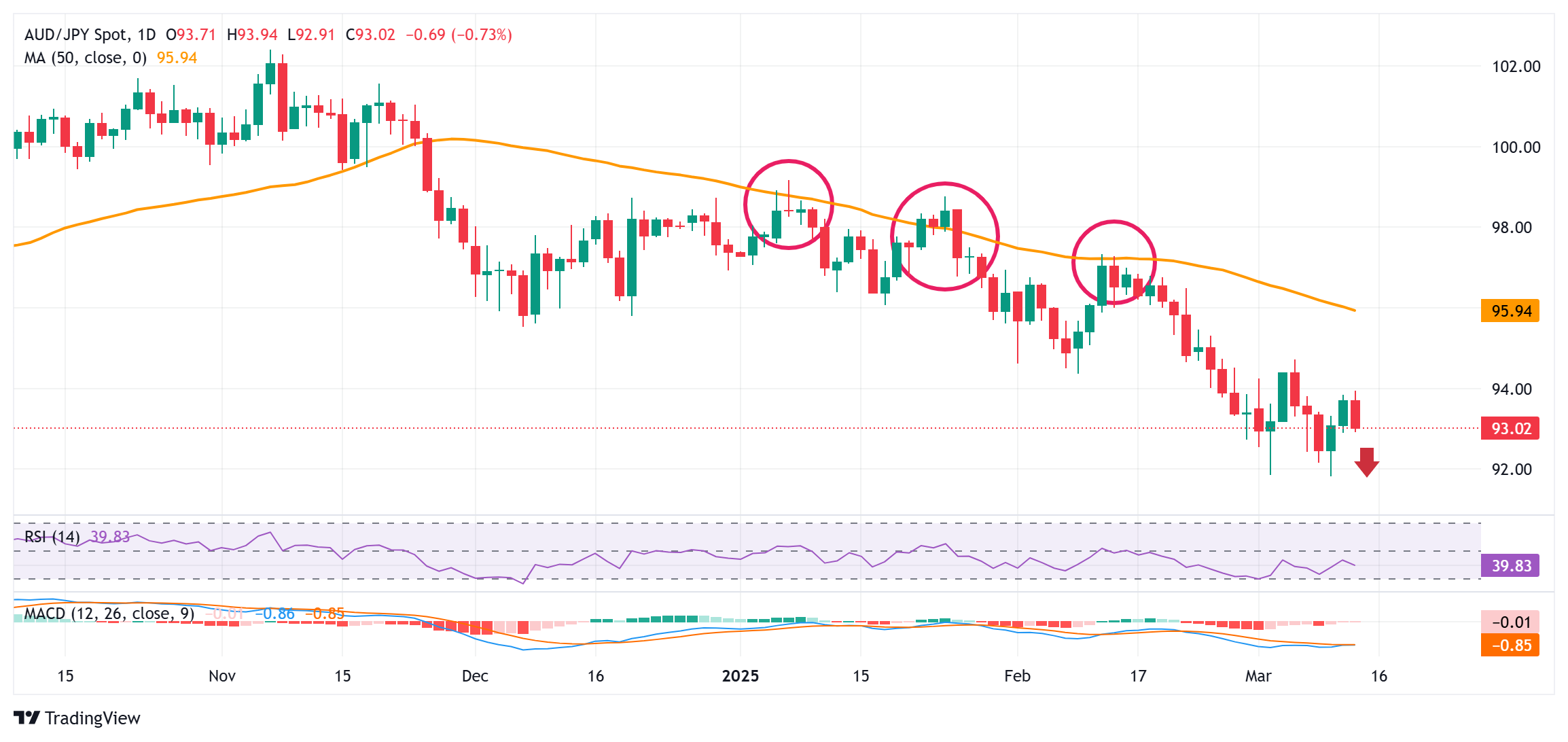 The AUD/JPY pair faces renewed selling pressure near the 94.00 mark, its weekly high reached earlier on Thursday, and continues its steady decline through the European session. Spot prices have dropped below 93.00, pausing a two-day recovery from the lowest level since August 2024, recorded on Tuesday.