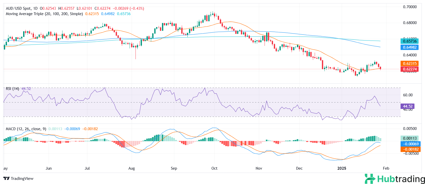 While the MACD suggests some upside potential, the RSI indicates ongoing bearish pressure. A failure to reclaim 0.6230 could trigger further selling, pushing AUD/USD toward new lows.