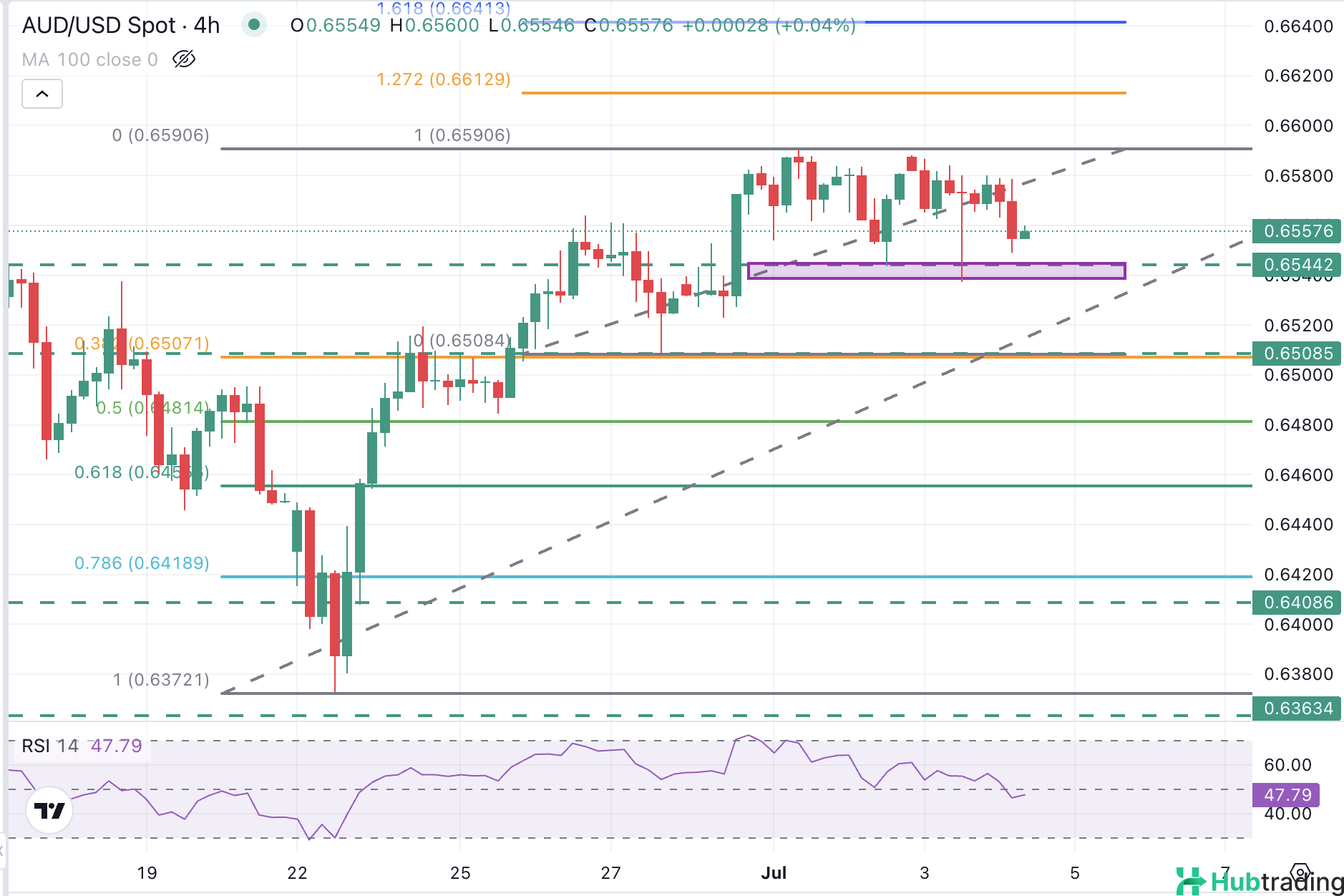 From a technical standpoint, AUD/USD is currently consolidating last week’s gains but is showing signs of a possible trend reversal. A double top has formed at the 0.6590 level—marked by the July 1 and 2 highs—while Thursday’s lower high and the 4-hour Relative Strength Index (RSI) dipping below the 50 mark suggest a shift in momentum toward the bears.