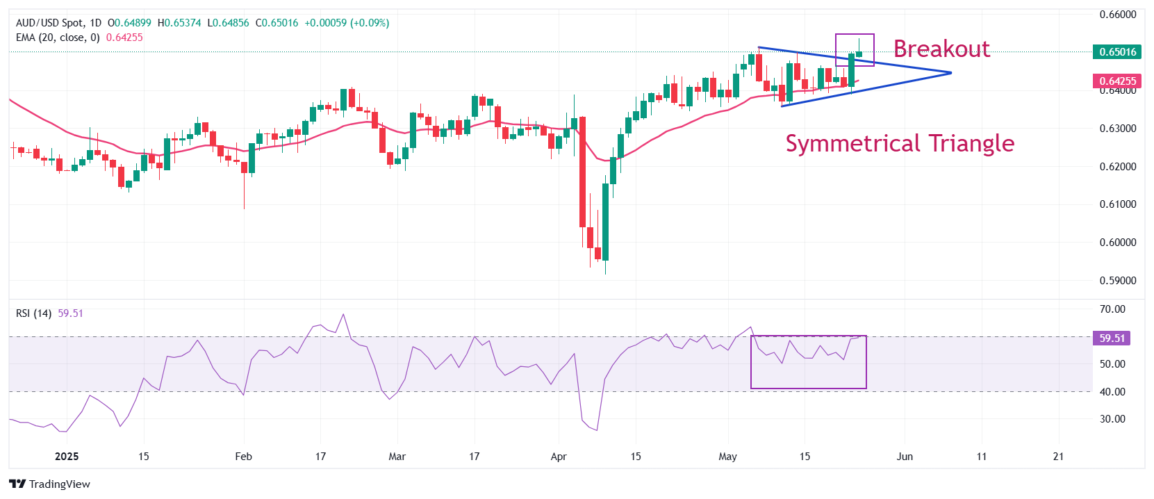 The AUD/USD pair gave up significant intraday gains after reaching a fresh six-month high near 0.6540 on Monday. The Aussie retraced most of its advance as the US Dollar (USD) recovered early losses, with the US Dollar Index (DXY) rising back toward 99.00 from an earlier monthly low of 98.70. The Australian Dollar showed strength amid improved risk sentiment following US President Donald Trump’s decision to postpone the proposed 50% tariffs on the European Union (EU) until July 9, granting more time for trade negotiations.