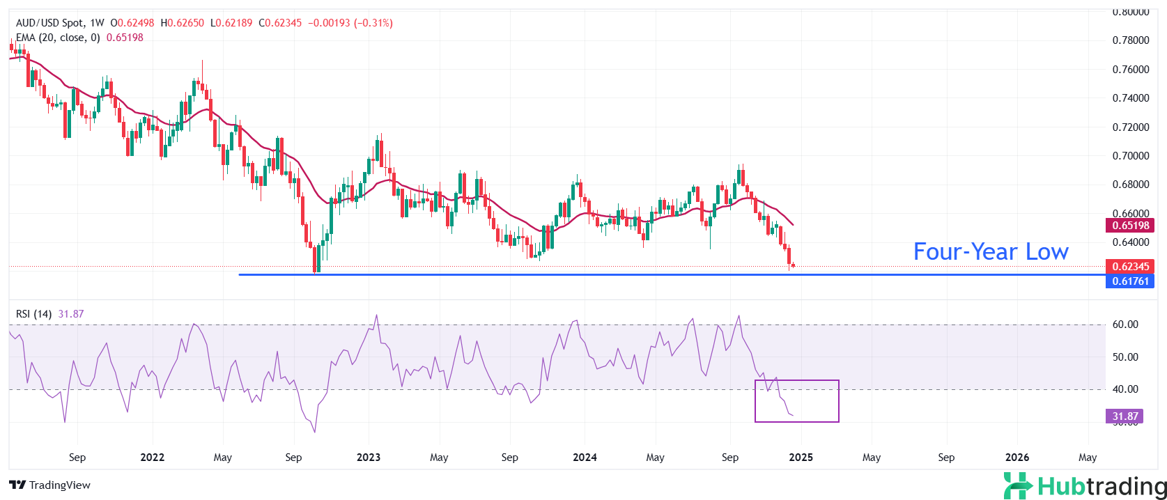 AUD/USD remains just above the four-year low of 0.6180, with a bearish outlook reinforced by the declining 20-week Exponential Moving Average (EMA) around 0.6520.