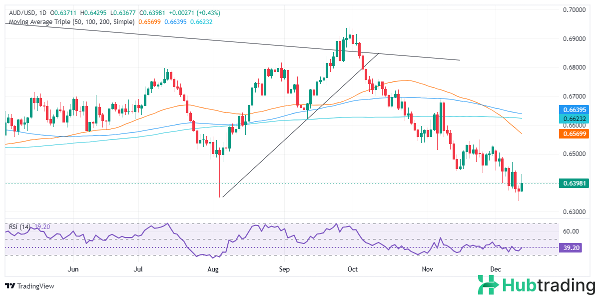 Upside Levels: If AUD/USD reclaims 0.6400, the next resistance level is 0.6500, followed by the 50-day Simple Moving Average (SMA) at 0.6568.