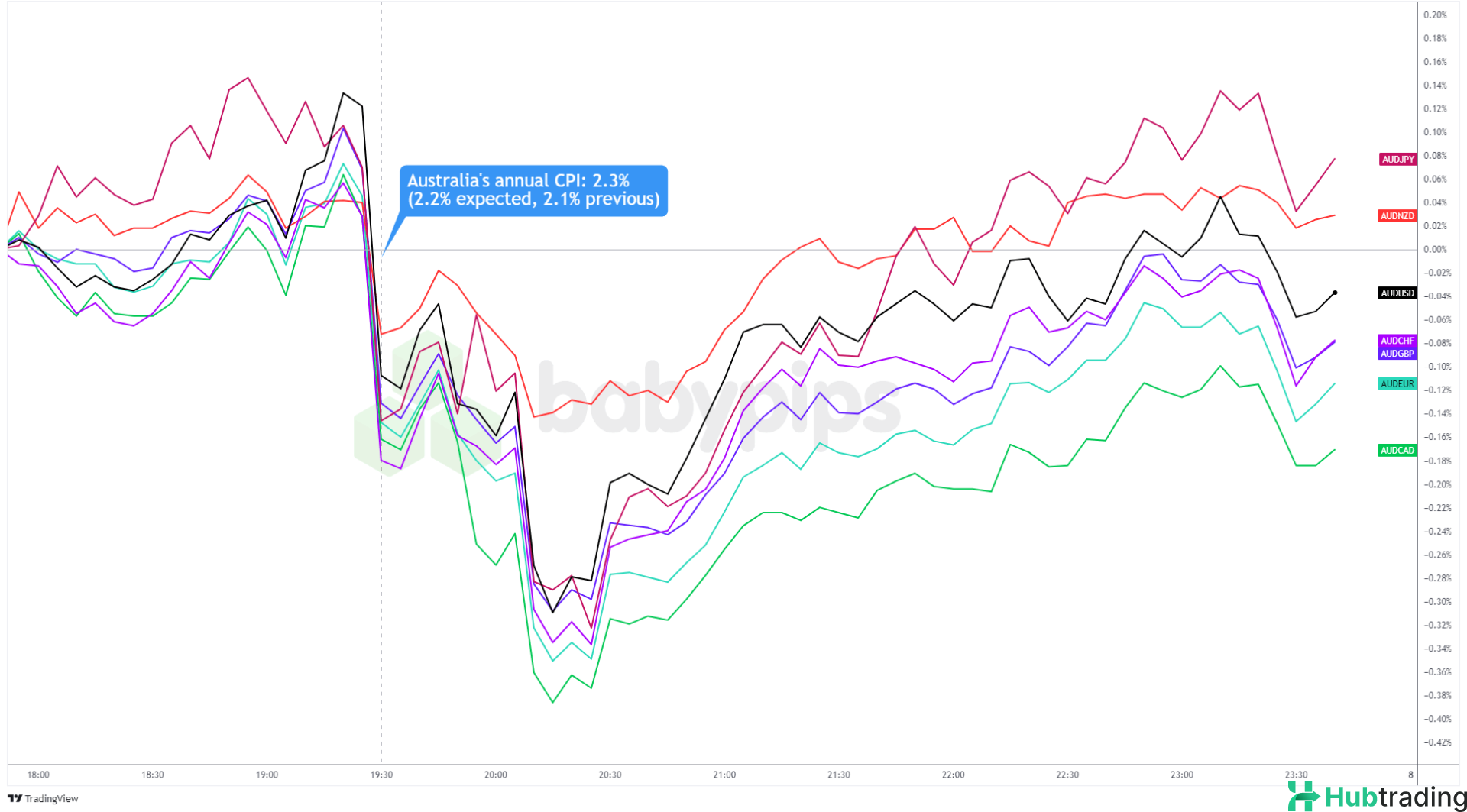 The Australian dollar, which had been recovering some losses from the U.S. session, saw a sharp drop following the release of the CPI data.