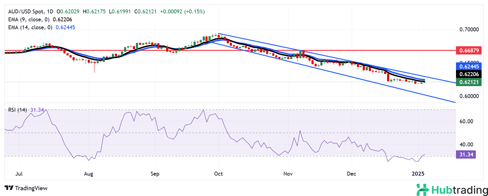 The AUD/USD trades near 0.6210 on Thursday, maintaining a bearish outlook as it remains within a descending channel on the daily chart. However, the 14-day Relative Strength Index (RSI) has rebounded above the 30 level, suggesting potential for a near-term upward correction despite the prevailing downtrend.