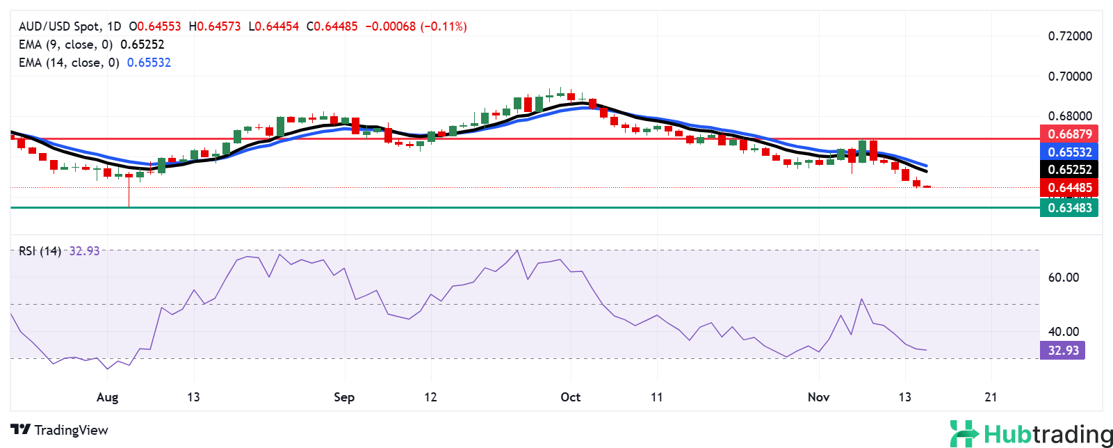 The AUD/USD pair trades near 0.6470 on Friday, facing short-term downward pressure while staying below the nine-day Exponential Moving Average (EMA). The 14-day Relative Strength Index (RSI) hovers slightly above 30, signaling potential oversold conditions.