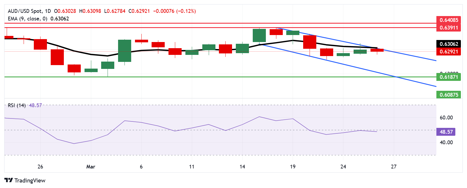 Key technical levels include support at 0.6210, near the lower boundary of the descending channel, and 0.6187, a seven-week low from March 5. On the upside, resistance at 0.6306, aligned with the nine-day Exponential Moving Average (EMA), remains a key hurdle. A breakout above this level could shift momentum toward the monthly high of 0.6391, reached on March 18.