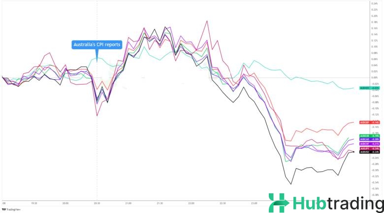 AUD spiked across the board as traders speculated the report wouldn’t shift the RBA’s stance. However, the upswing was brief, with the Australian dollar hitting new intraday lows as broader risk aversion and caution ahead of key events later in the week tempered gains.