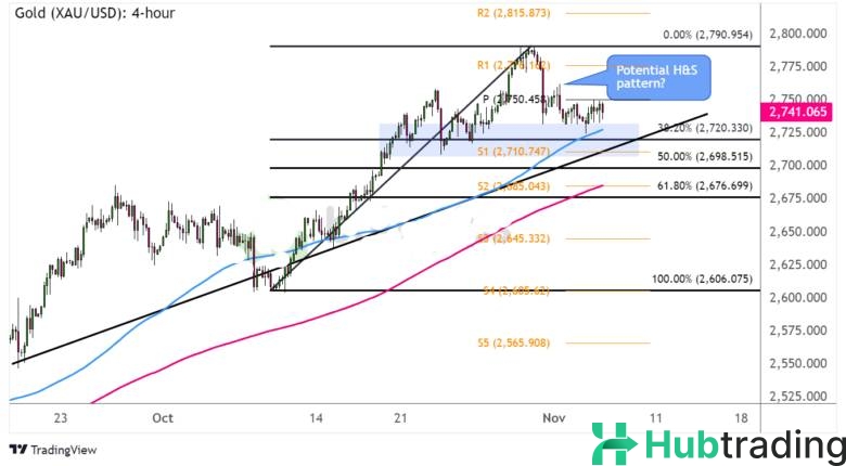Gold traders are feeling uneasy ahead of the U.S. election results, as the precious metal hovers just above key support at $2,725. This level coincides with the potential neckline of a head and shoulders reversal pattern.