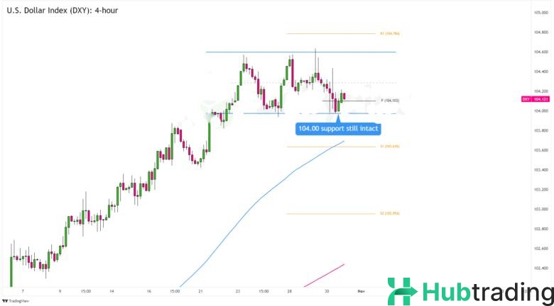 The U.S. Dollar Index (DXY) recently retested Friday's lows near 104.00, where it also encountered buying pressure at this psychological level.