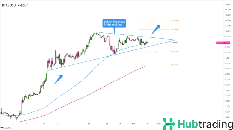 Yesterday, Bitcoin (BTC/USD) briefly dipped below the $94,000 level but has since regained momentum, staying supported within a potential continuation chart pattern.