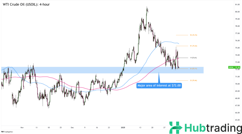 WTI crude saw a sharp selloff but is currently stabilizing around the S1 Pivot Point at $72.11, a key level from late 2024.