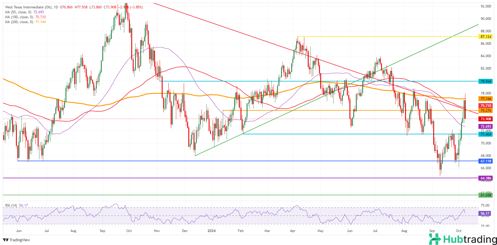 The recent sell-off in crude oil prices comes after a strong rally driven by geopolitical tensions, which have now eased slightly due to the lack of a significant military response from Israel. Combined with concerns over China and Libya’s rising output, the correction gains further traction. A deeper pullback is likely until strong support levels are reached.