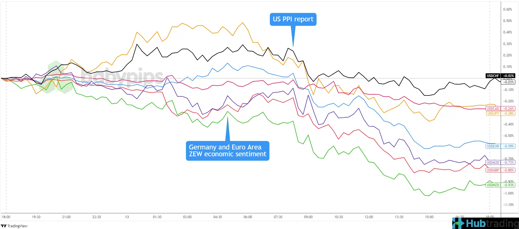 During the U.S. session, the dollar weakened broadly in response to disappointing U.S. PPI reports, which fueled speculation about potential Fed rate cuts. This shift in sentiment led to a drop in U.S. 10-year Treasury yields and fostered increased risk-taking across the markets.