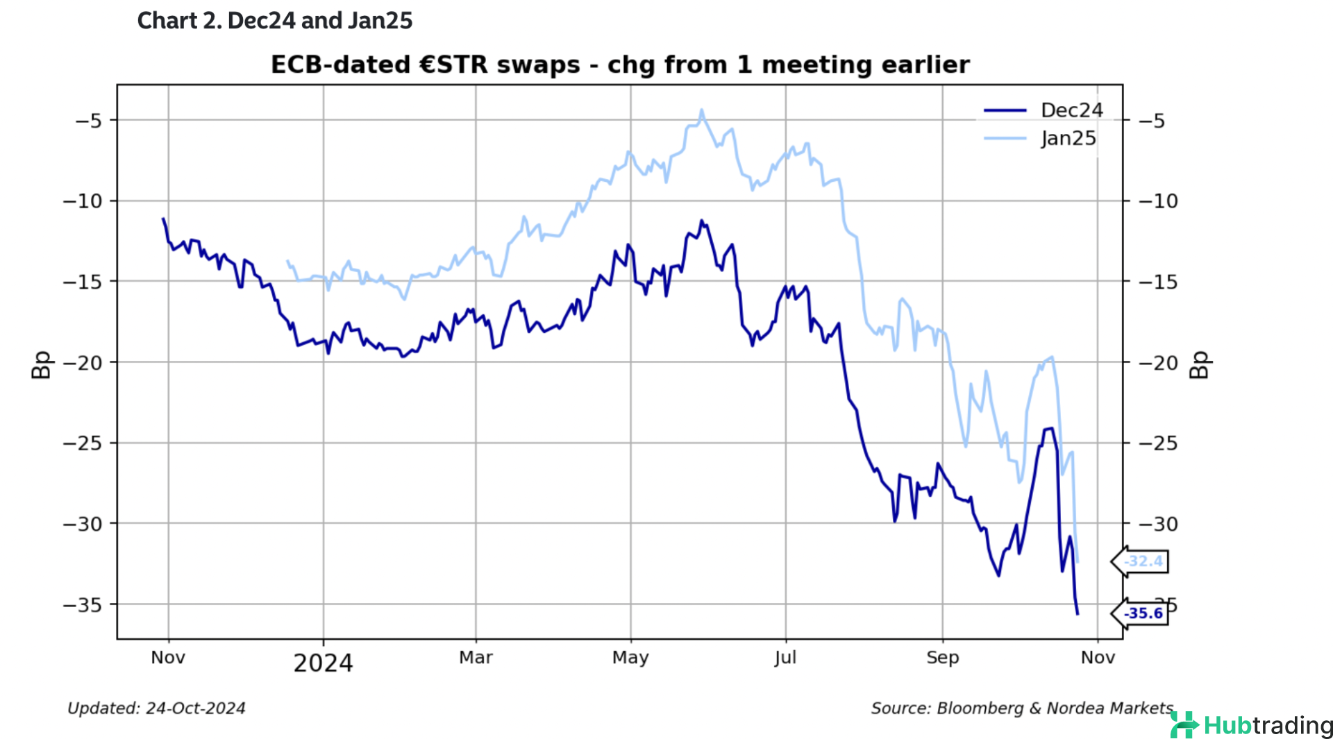 The report heightened speculation that the ECB might implement a more aggressive rate cut at its final meeting of the year in December. Swap rates are pricing in an increasing likelihood of a 50 bps reduction. “Rates are falling significantly as markets are pricing a higher probability of the ECB going for a 50 bps rate cut in December,” noted Andres Larsson, Senior FX Analyst at Nordea Bank, who also mentioned the market’s expectation for rates to eventually dip below neutral.