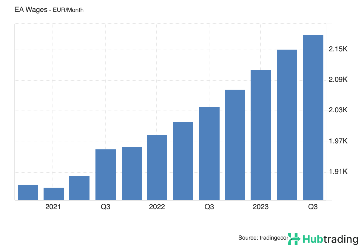 Official data showed Eurozone wages rose 4.5% in Q2, down from 5.2% in the previous quarter, but still high. The Eurozone’s Average Monthly Wage reached EUR 2,180 in September, indicating ongoing upward wage pressures.