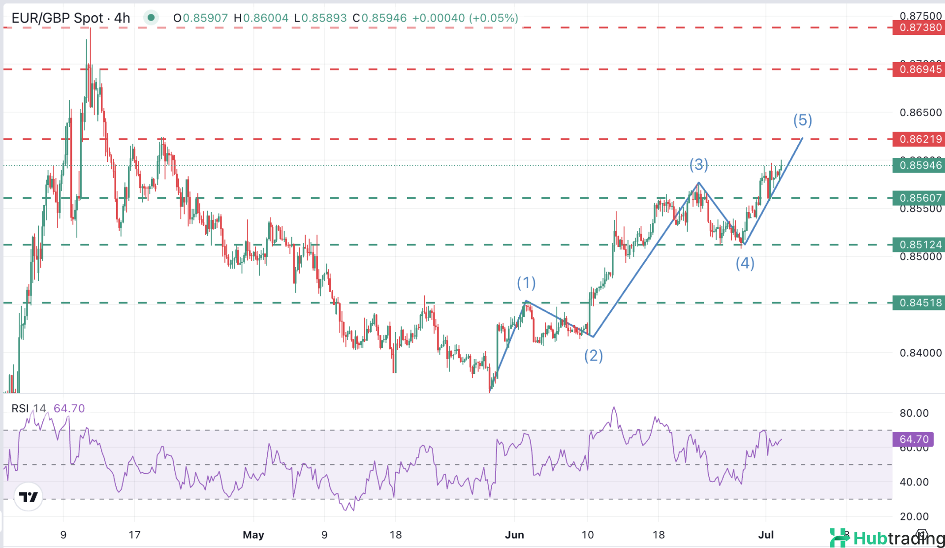 EUR/GBP appears to be advancing within the fifth wave of an Elliott Wave bullish cycle that began from the late-May lows. The limited pullbacks support the bullish bias, with the 0.8615–0.8620 zone—lows from April 16 to 22—emerging as a near-term target.