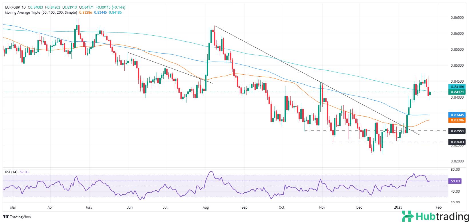EUR/GBP remains below the 200-day Simple Moving Average (SMA) at 0.8422, signaling bearish pressure. However, buyers have stepped in near the 0.8400 level, preventing further declines.
