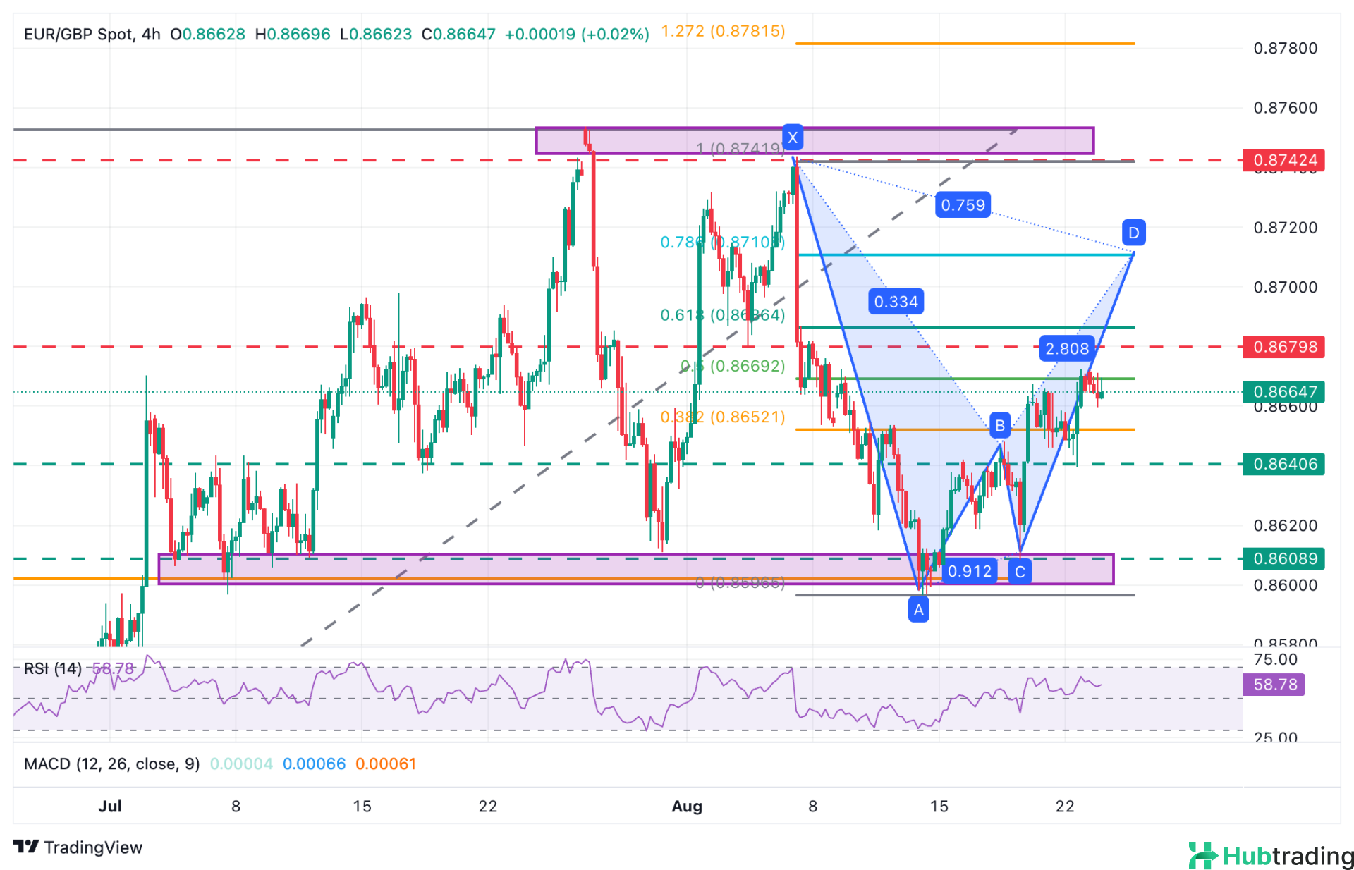 A developing Gartley harmonic pattern suggests that bulls may target the August 5 support zone around 0.8680 and the 61.8% Fibonacci retracement of the early August decline at 0.8685. A further move higher could bring the pair to test the 78.6% Fibonacci level just above 0.8700, a common target during corrective rallies.