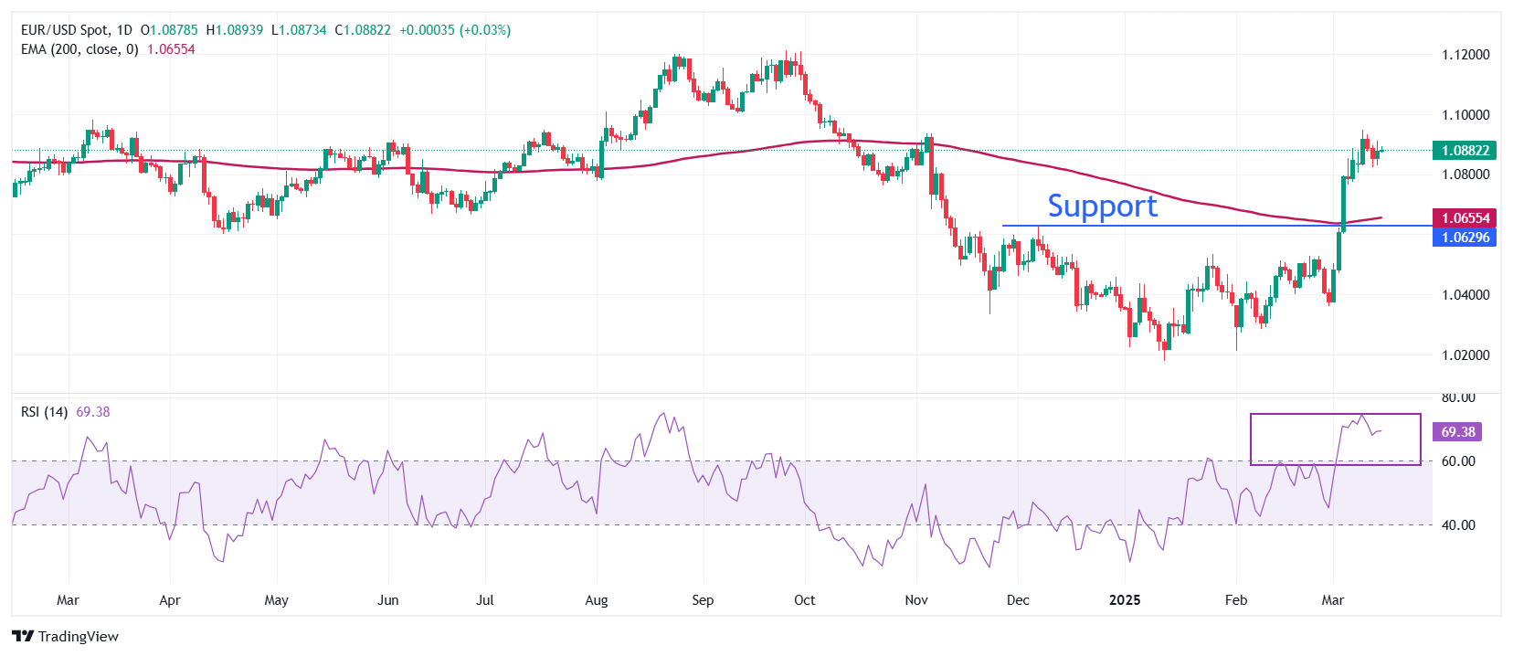 EUR/USD climbs toward 1.0900 on Monday, maintaining a strong long-term outlook as it trades above the 200-day Exponential Moving Average (EMA), currently around 1.0655.