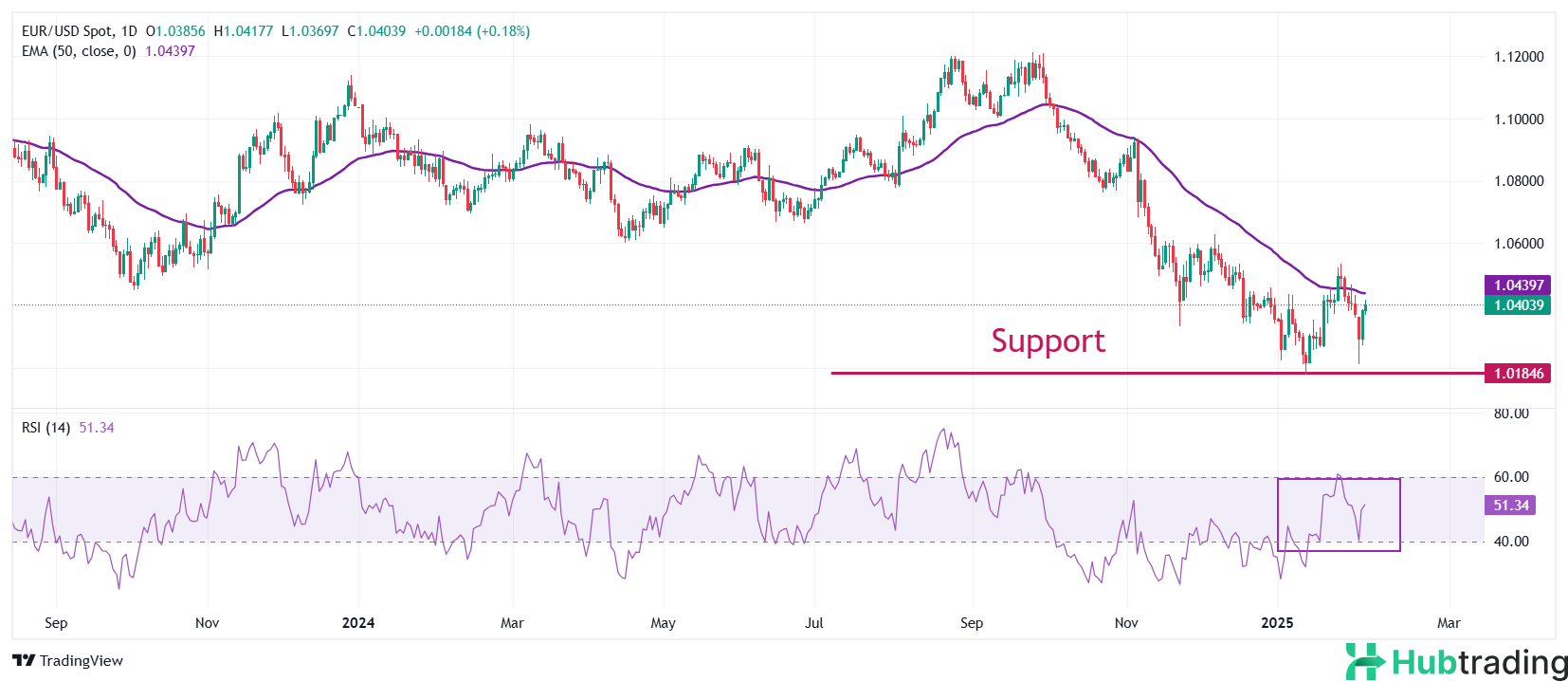 EUR/USD has rebounded from Monday's three-week low of 1.0210, rallying past 1.0400. However, the pair remains below the 50-day Exponential Moving Average (EMA) at 1.0440, indicating that the broader trend is still bearish.
