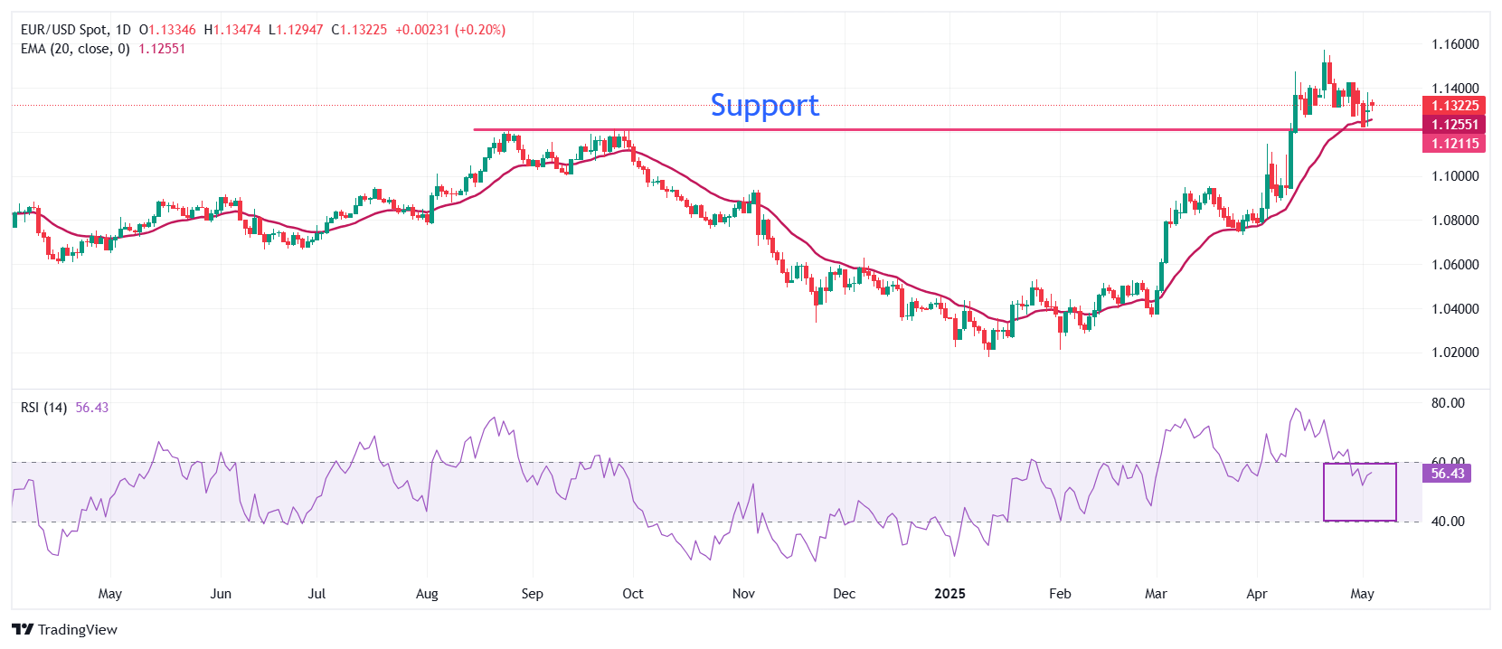 EUR/USD maintains its recovery above the key 1.1300 level on Monday, bouncing back from a three-week low of 1.1265 reached on Thursday. The pair found support near the 20-day Exponential Moving Average (EMA) around 1.1260, fueling the rebound.