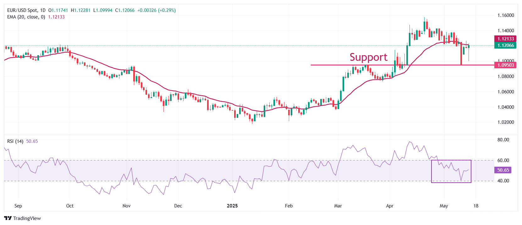 EUR/USD rose 0.15% to around 1.1200 during Thursday’s North American session, gaining strength as the US Dollar faced selling pressure following softer-than-expected US Producer Price Index (PPI) and Retail Sales data for April.