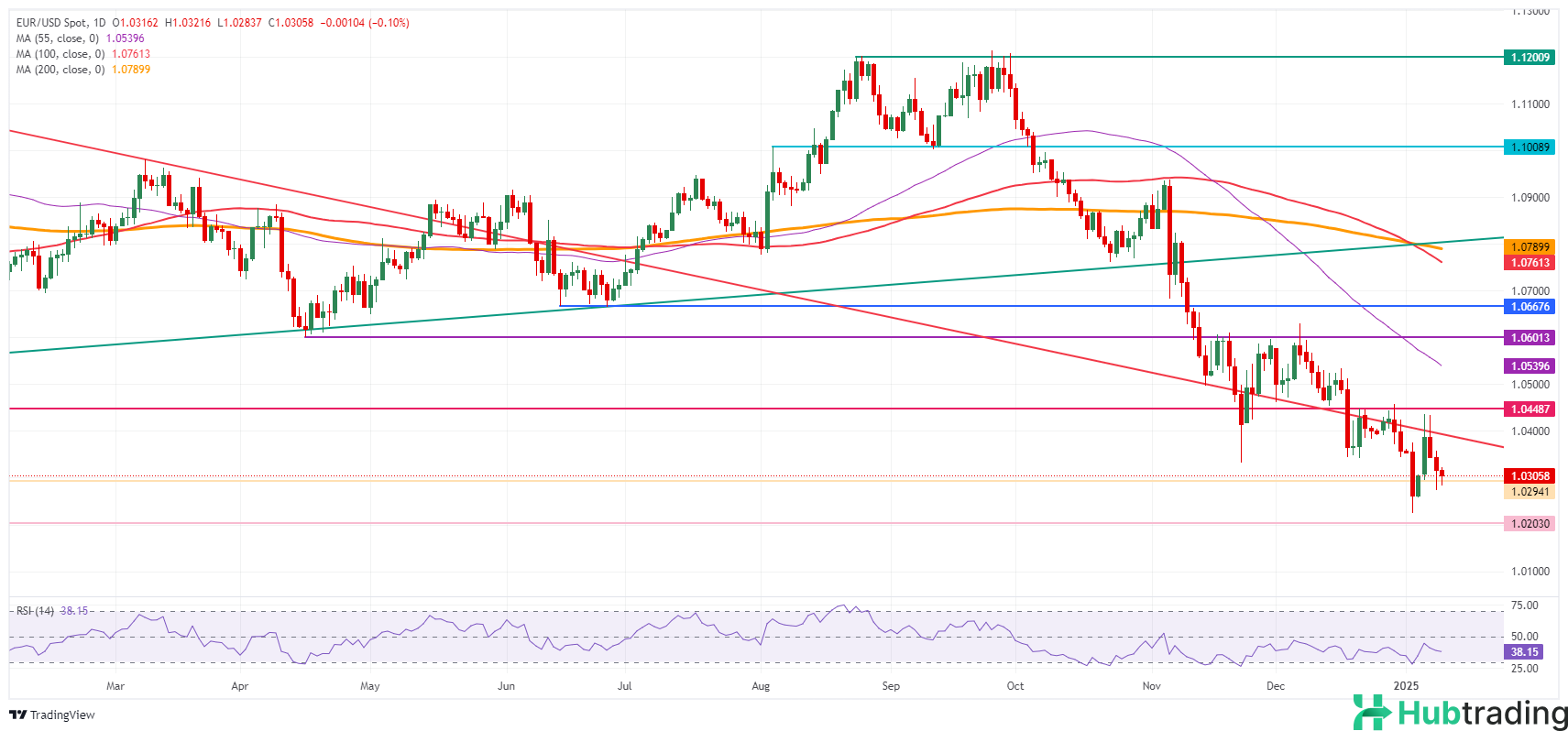 The EUR/USD pair remains under pressure, consolidating around 1.0300 on Thursday. The recent dip comes as markets grow increasingly concerned about the wide-ranging measures, reforms, spending, and tariff proposals announced by President-elect Donald Trump ahead of his inauguration on January 20. This has led to a further rise in US yields this week.
