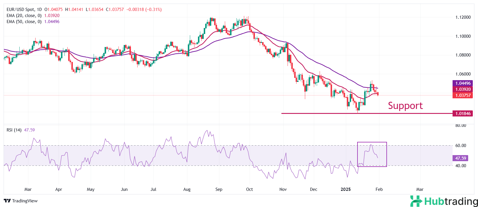 EUR/USD declines toward 1.0370 during Friday's European session, slipping below the 20-day Exponential Moving Average (EMA) at 1.0390. The pair continues its downward correction after failing to hold above the 50-day EMA, which currently stands at 1.0449.