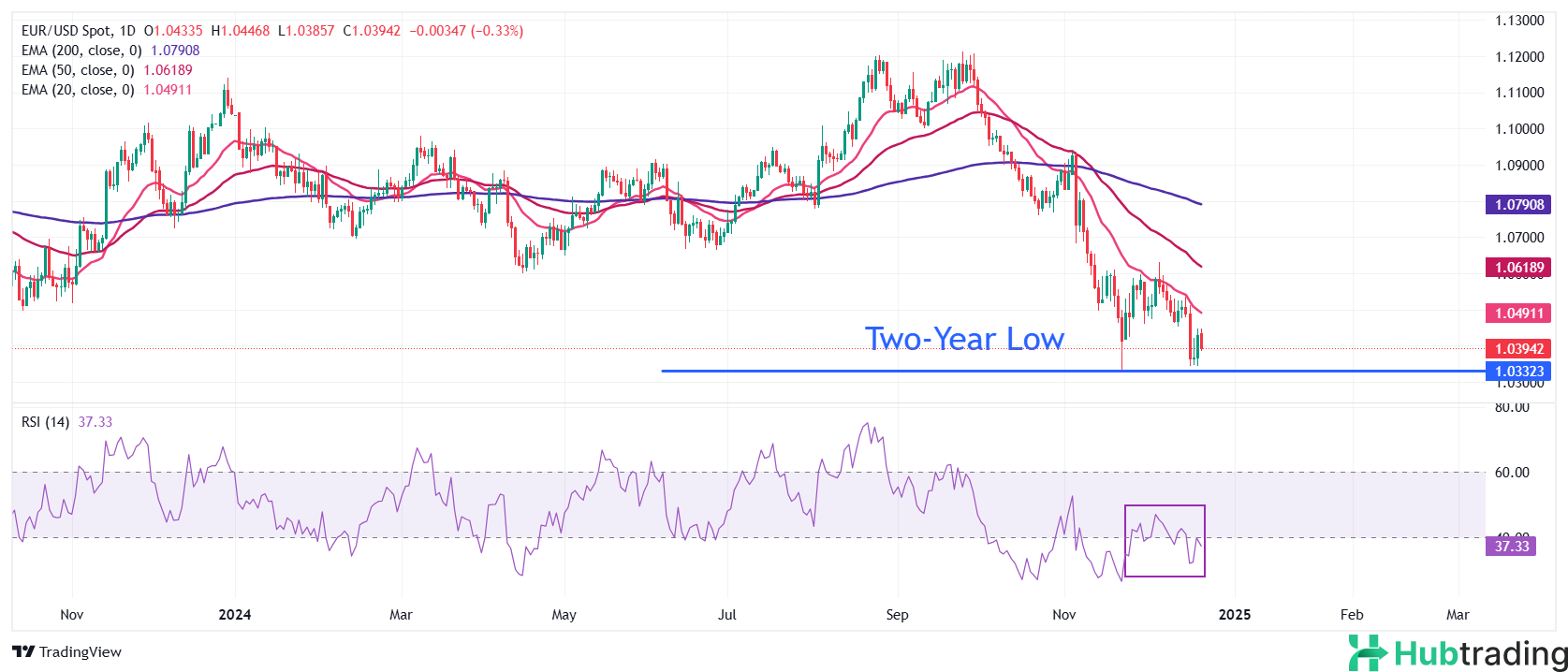 The EUR/USD remains below the 1.0400 mark during Monday’s North American session as the US Dollar (USD) recovers following Friday’s sharp sell-off. The US Dollar Index (DXY), which measures the Greenback’s strength against six major currencies, rises to around 108.20. This recovery is fueled by indications from Federal Reserve (Fed) policymakers that the central bank may deliver fewer interest rate cuts in 2025 due to persistent disinflationary challenges and economic uncertainties tied to President-elect Donald Trump’s incoming policies on immigration, trade, and taxation.