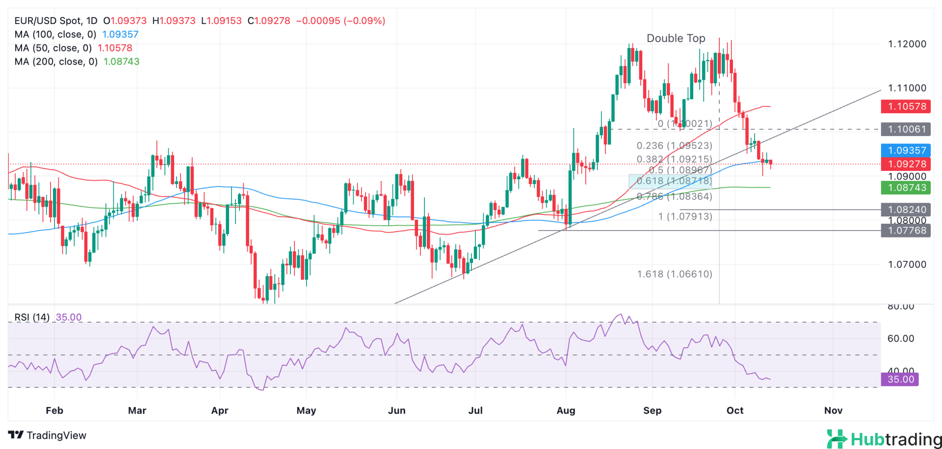 The initial downside target for this pattern is set at 1.0872, corresponding to the 61.8% Fibonacci extension of the pattern's height extrapolated downward (indicated by the blue shaded rectangle on the chart). Additional targets include 1.0874, aligning with the 200-day SMA, and 1.0824, based on the trendline break. Furthermore, momentum, as indicated by the Relative Strength Index (RSI), is moving in tandem with the price action, suggesting a bearish outlook.