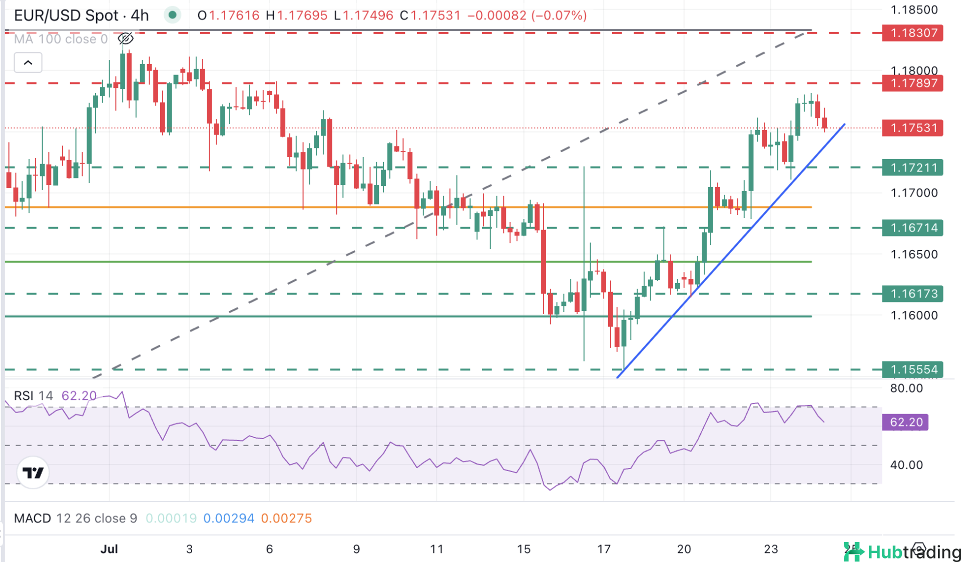 In the European morning session, the Euro (EUR) trades at 1.1750, easing from a three-week high of 1.1780 reached following news of a potential EU-US trade deal. Still, the pair holds its short-term bullish bias, supported by a weaker US Dollar (USD) amid improved market risk sentiment.