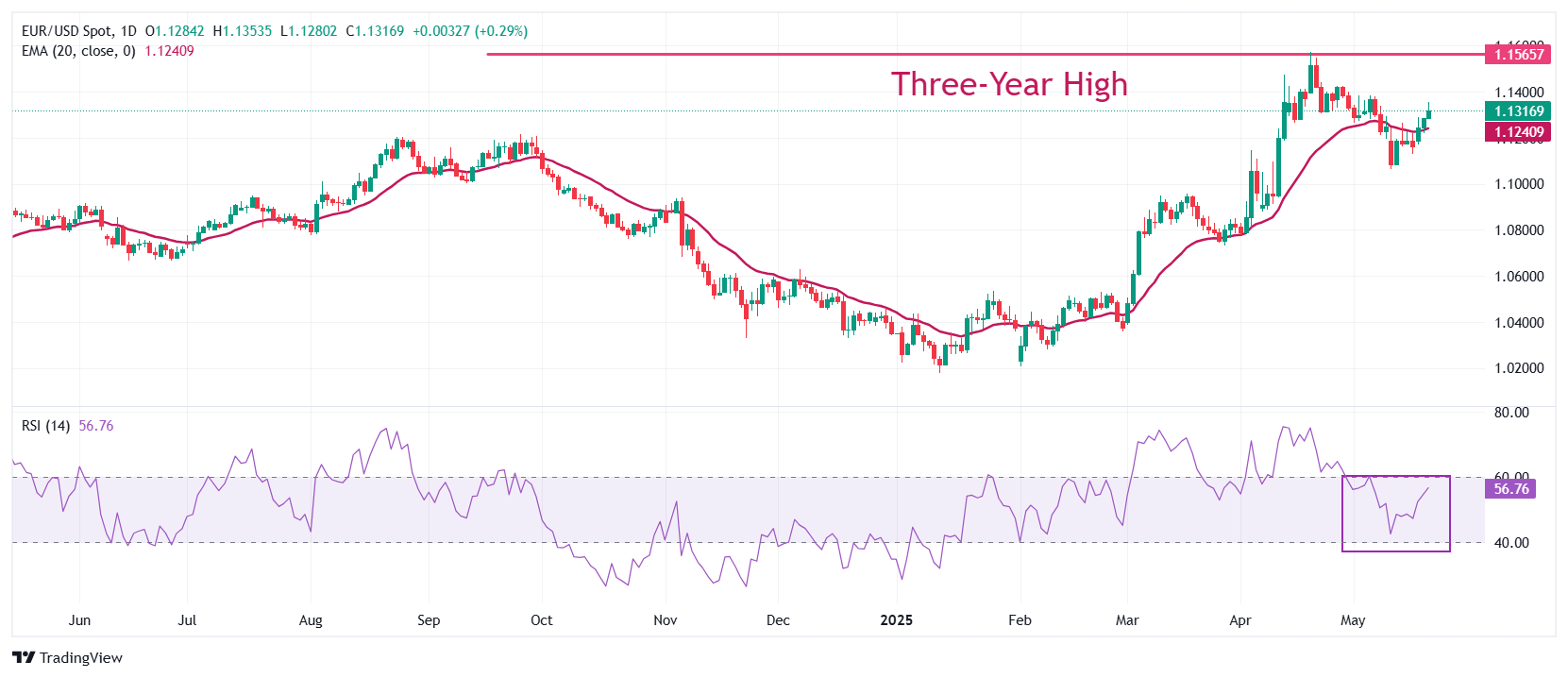 The EUR/USD pair rallied close to 1.1350 on Wednesday, marking its third consecutive day of gains. The Euro’s strength is largely driven by persistent weakness in the US Dollar (USD), which remains under heavy selling pressure following a downgrade to the United States (US) credit rating and rising political and fiscal concerns. The US Dollar Index (DXY), which measures the value of the USD against a basket of six major currencies, trimmed some of its earlier losses but still trades 0.3% lower near 99.70.