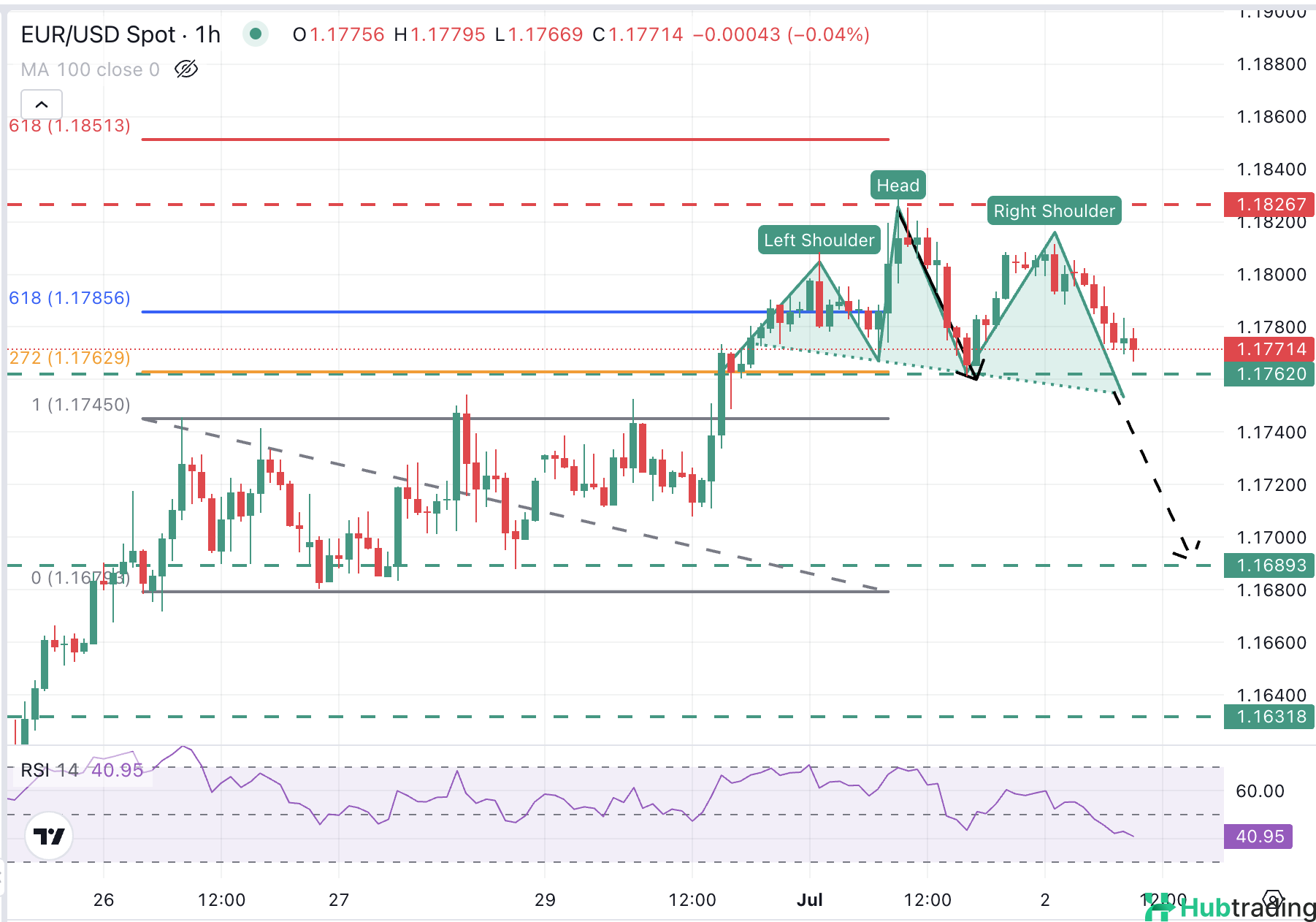 On the 1-hour chart, a lower high has formed at 1.1810, signaling weakening bullish strength. The 14-period RSI has moved into negative territory, and a potential Head & Shoulders pattern is emerging. The neckline sits at Tuesday’s low of 1.1760. A break below this level would confirm the pattern, pointing to a projected downside target near 1.1690. Further support lies at the June 27 low of 1.1680 and the June 26 low of 1.1650.