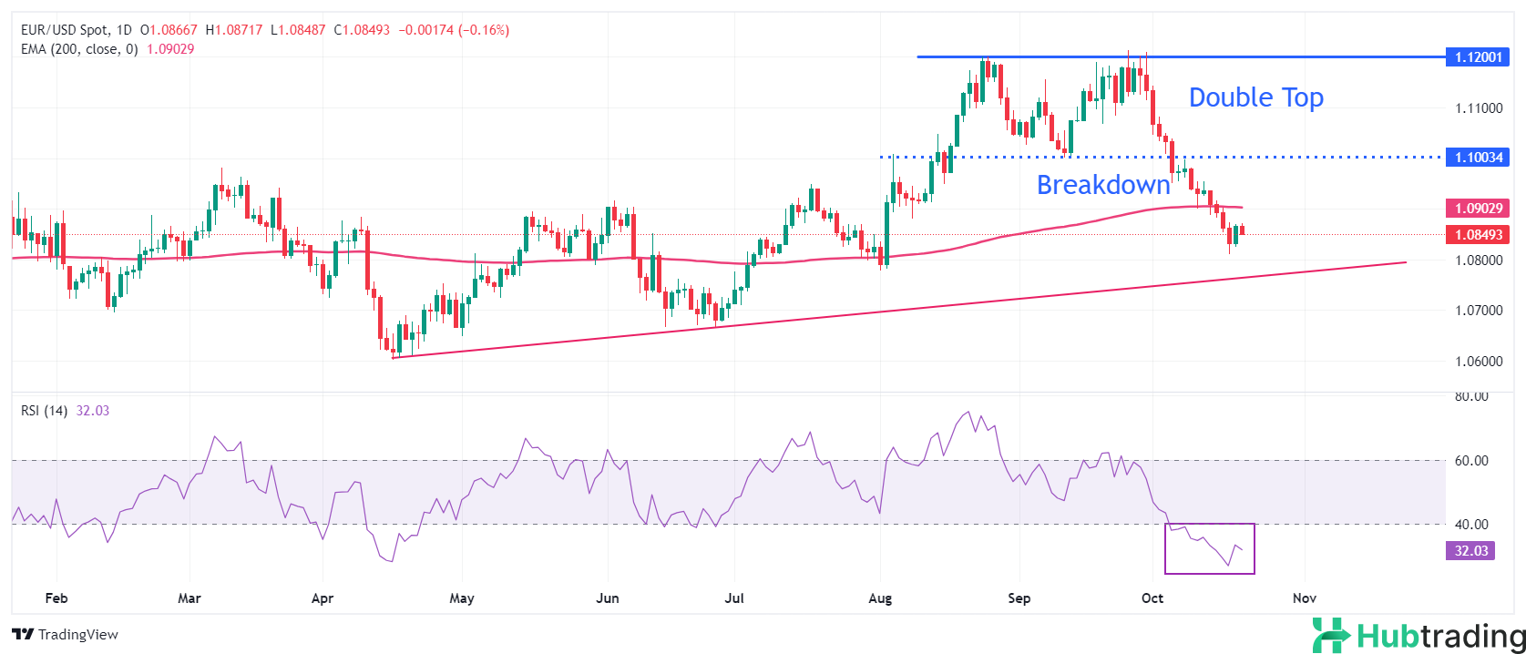 The downward movement began after a breakdown of a Double Top formation on the daily chart, falling below the September 11 low near 1.1000, signaling a bearish reversal.