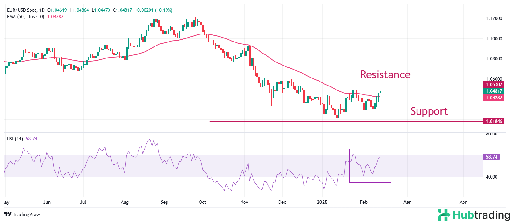 EUR/USD continues its recovery, climbing near 1.0480 during European trading hours. The pair recently moved above the 50-day Exponential Moving Average (EMA) at 1.0428, signaling further bullish momentum.