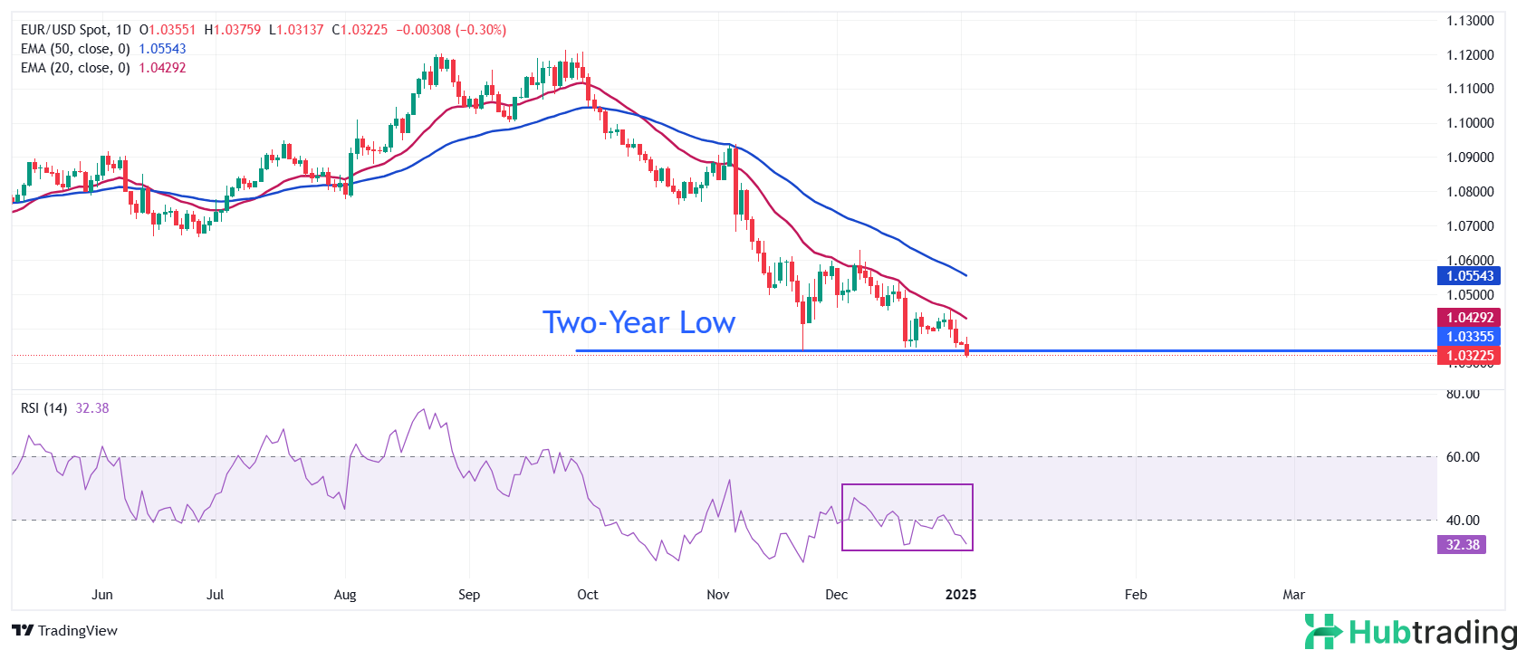 EUR/USD hits a fresh two-year low below 1.0320 on the first trading day of the year as the US Dollar (USD) continues to strengthen. The Dollar Index (DXY) climbs above 108.60, buoyed by optimism that the Federal Reserve (Fed) will implement fewer rate cuts than previously anticipated in 2025.
