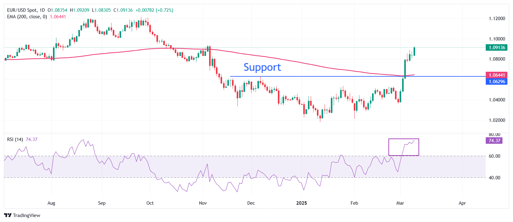 - EUR/USD climbs above 1.0900 as the US Dollar weakens further amid rising concerns over the US economic outlook.