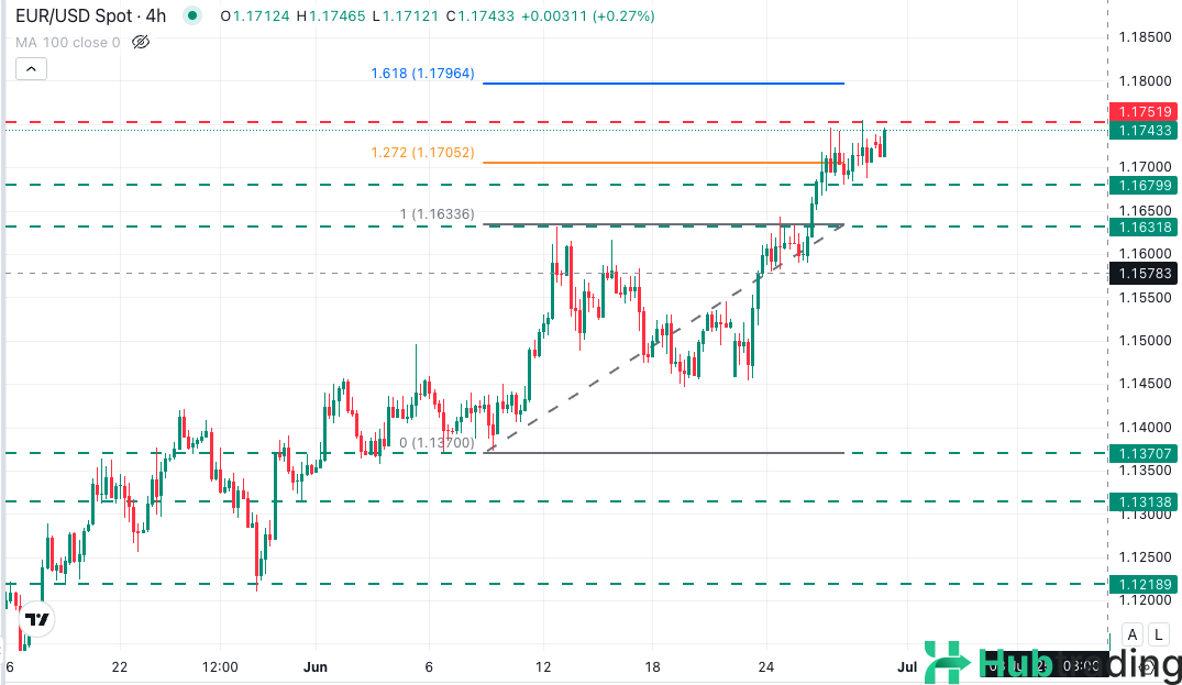 Immediate resistance lies at 1.1745, the highs from June 26–27. A breakout above this level would expose the next target at 1.1795, which corresponds to the 161.8% Fibonacci extension of the June 10–12 rally.