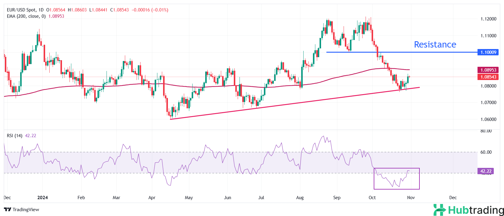 EUR/USD remains steady near 1.0850 during Thursday’s European session, following a sharp recovery on Wednesday. The currency pair gained traction as traders scaled back expectations for a significant interest rate cut from the European Central Bank (ECB) in December, thanks to better-than-anticipated Eurozone GDP growth and rising German inflation.