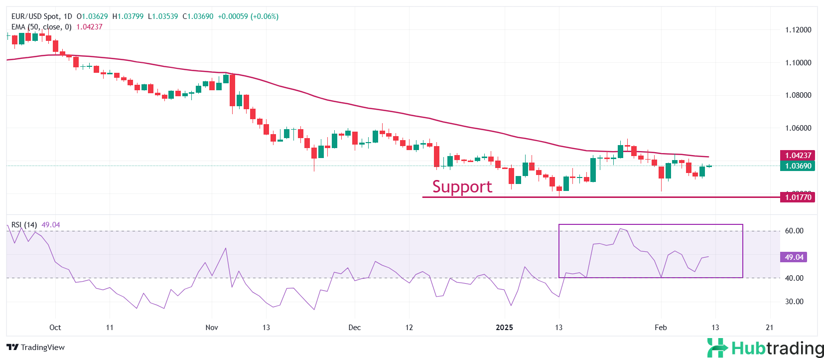 EUR/USD remains firm near 1.0380, recovering from the critical 1.0300 support level. However, the pair faces resistance at the 50-day Exponential Moving Average (EMA) around 1.0423, limiting bullish momentum.