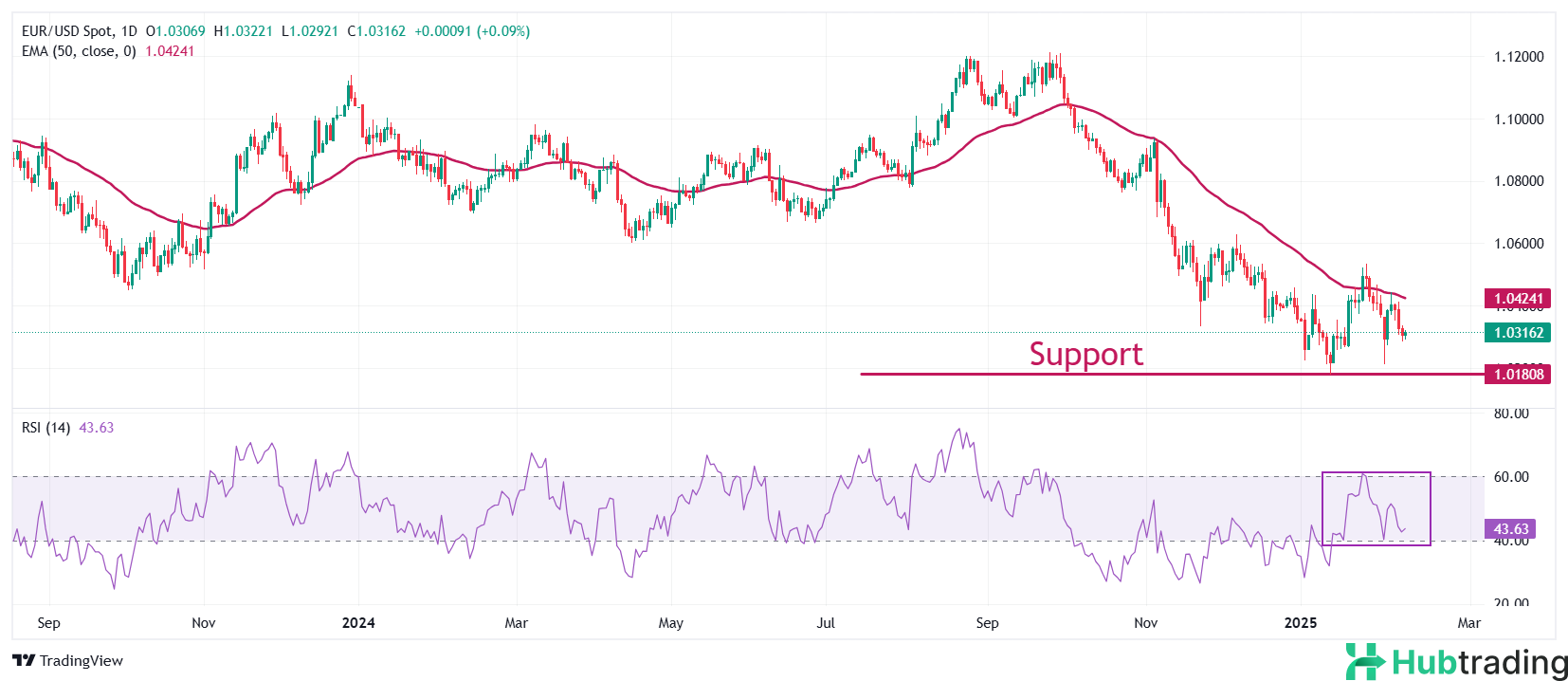EUR/USD continues to consolidate within Monday’s trading range around 1.0300, with the 50-day Exponential Moving Average (EMA) near 1.0430 acting as a key resistance level. The 14-day Relative Strength Index (RSI) fluctuates between 40.00 and 60.00, reflecting a neutral market sentiment.