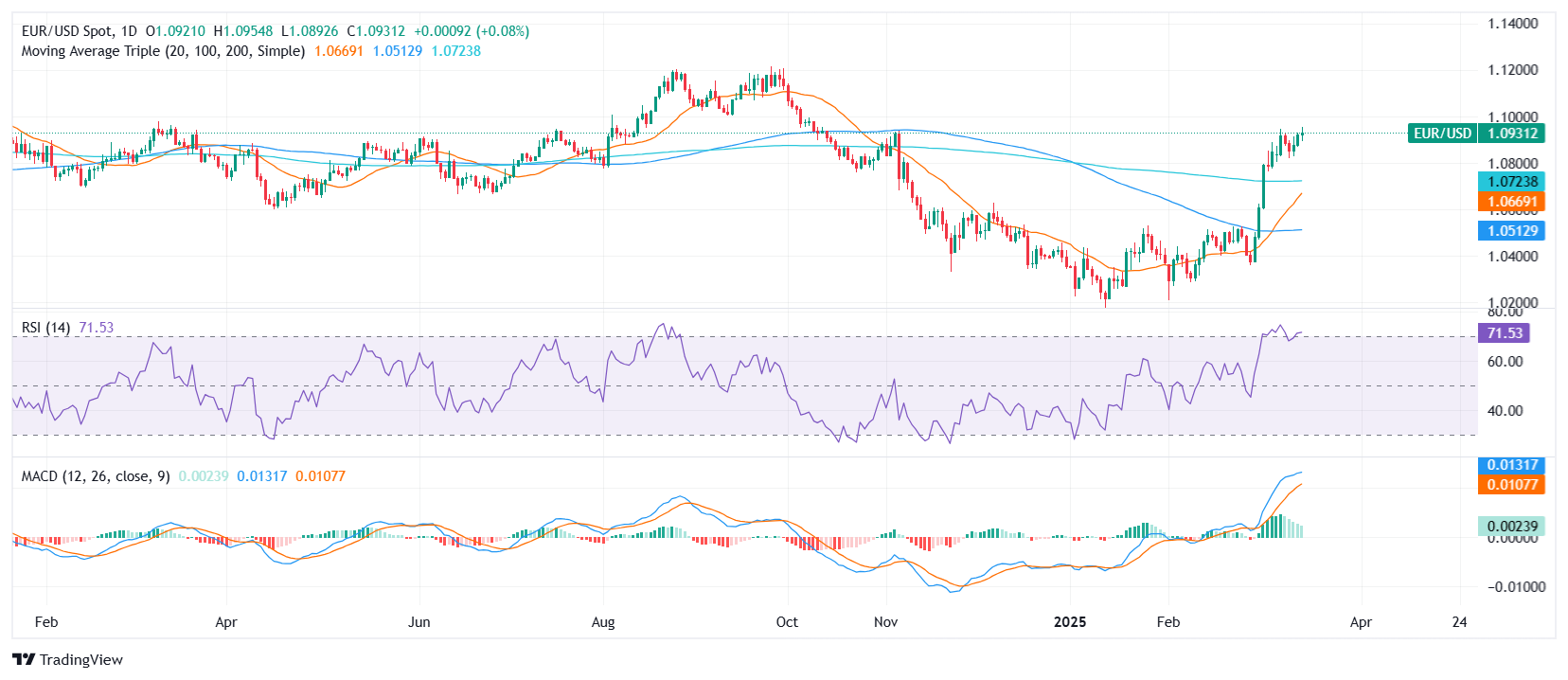 From a technical standpoint, the Relative Strength Index (RSI) sits at 73, indicating overbought conditions, though it has started to flatten, signaling a slowdown in bullish momentum. Similarly, the Moving Average Convergence Divergence (MACD) is displaying flat green bars, reflecting a lack of strong trend conviction. These factors suggest that EUR/USD may enter a consolidation phase before making a decisive move.