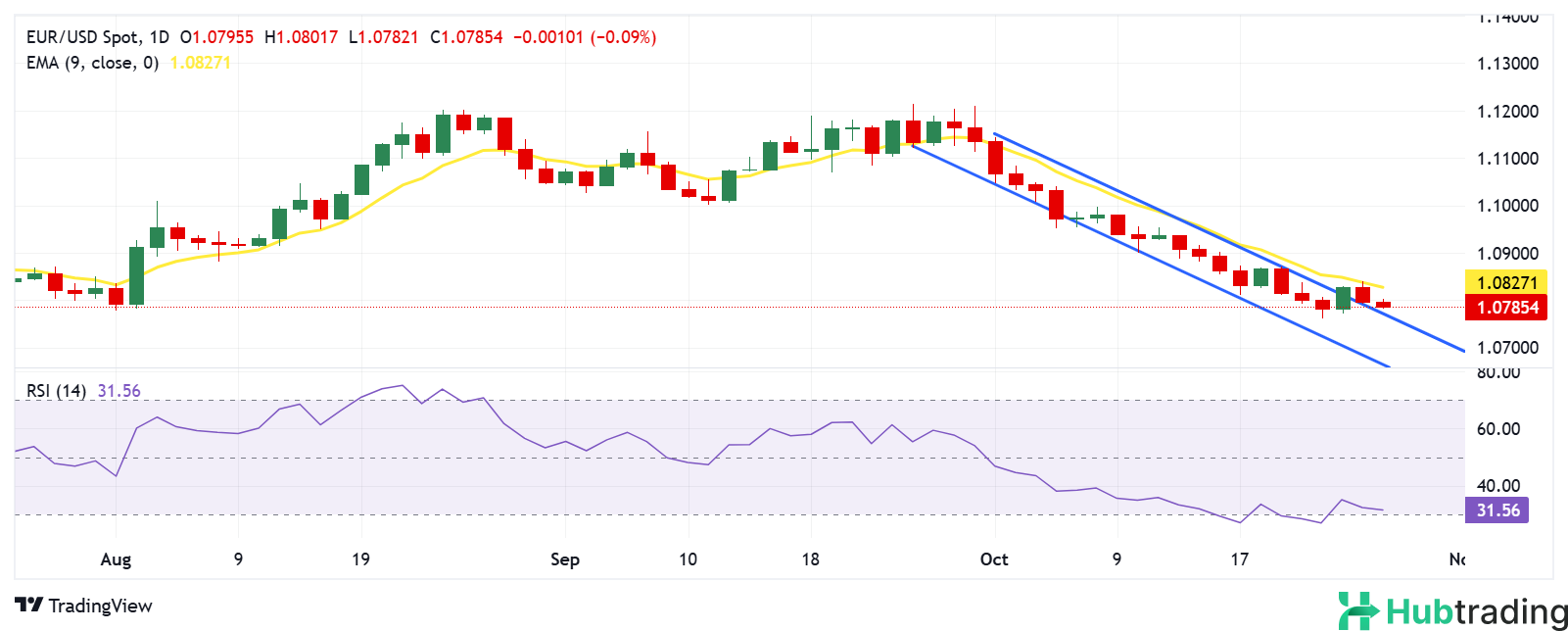 The EUR/USD pair has edged lower for the second consecutive day, currently trading around 1.0780 during the Asian session on Monday. An examination of the daily chart reveals that the pair is testing the upper boundary in an effort to re-enter the descending channel pattern, which could reinforce a bearish sentiment for the pair.