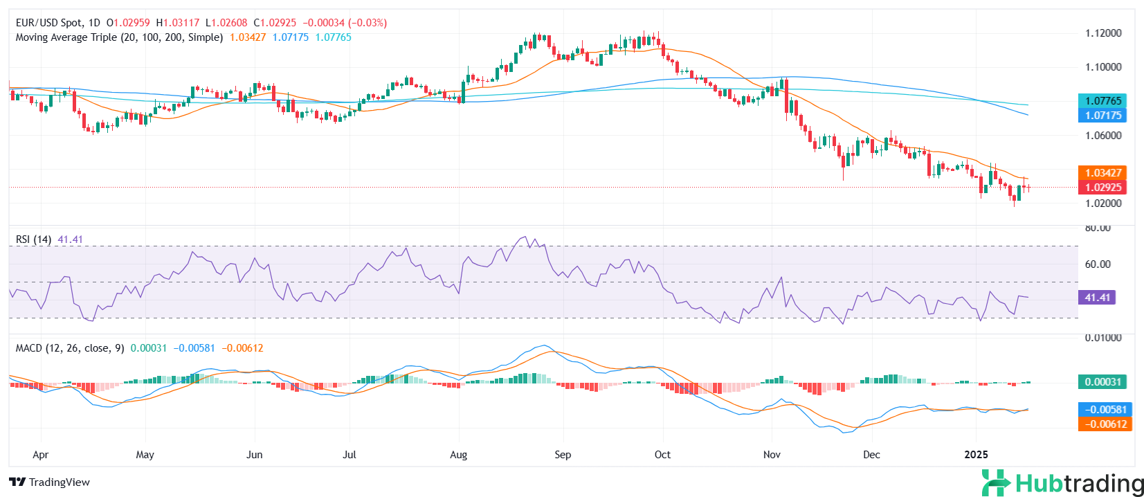 The EUR/USD pair attempted to stabilize on Thursday but still edged lower by 0.23%, settling near 1.0270. Early buying efforts were thwarted by the pair’s inability to sustain a move above the 20-day Simple Moving Average (SMA), highlighting the fragile nature of its recovery.