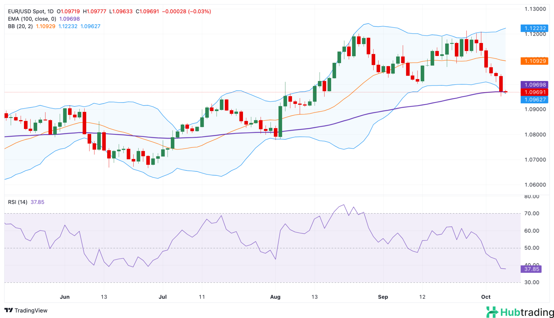 The EUR/USD pair remains in negative territory for the seventh consecutive day, trading near 1.0965 during Monday's early European session. The pair continues to face selling pressure due to the strengthening US Dollar (USD), following the release of strong US jobs data on Friday, which has led traders to scale back expectations of a 50 basis point (bps) rate cut by the Federal Reserve in November.