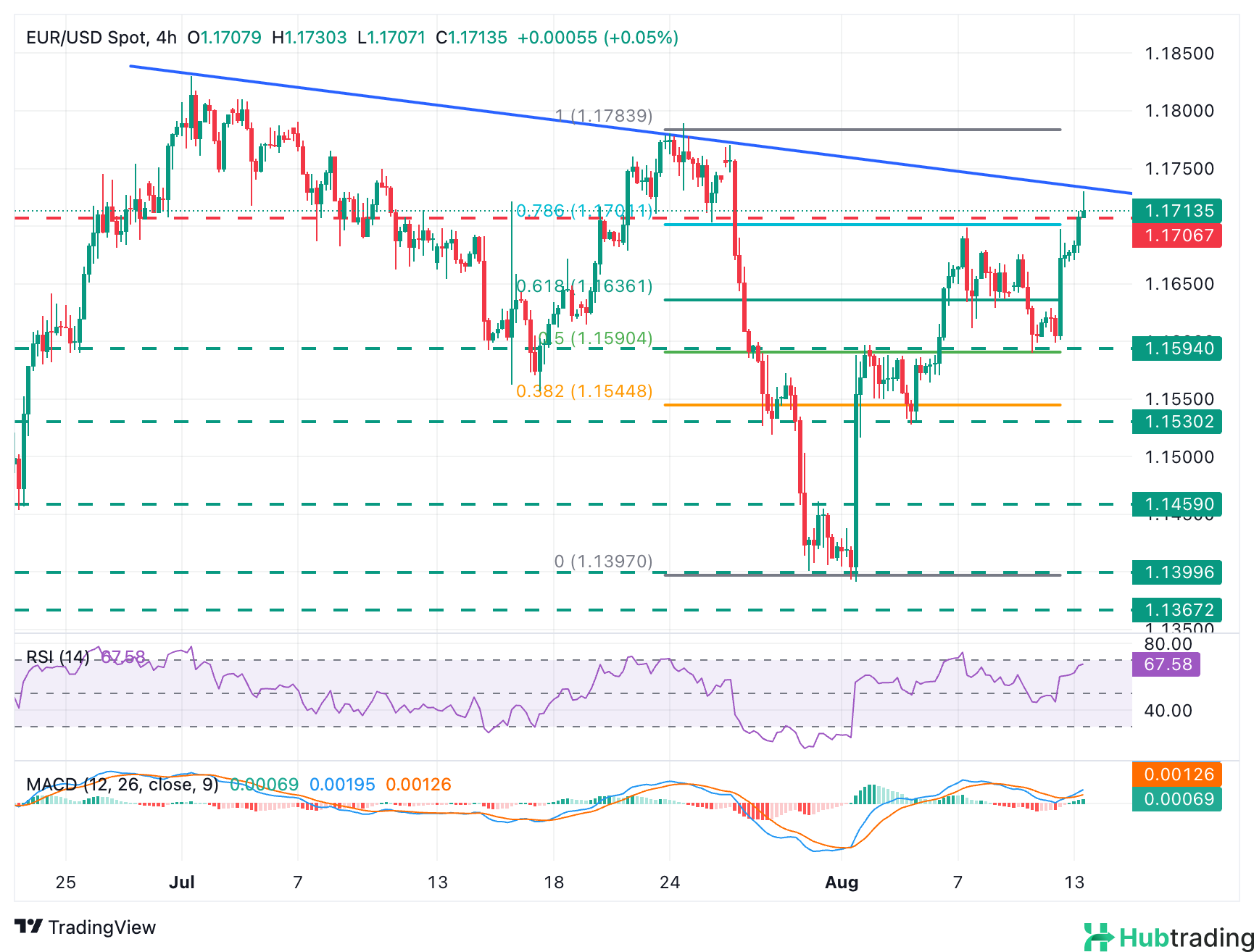 EUR/USD continues to trade above the 1.1700 mark ahead of Wednesday’s U.S. session, after reaching a fresh two-week high of 1.1730. The pair extended its rally for a second straight day, supported by softer U.S. Consumer Price Index (CPI) data and growing speculation of a Federal Reserve interest rate cut in September. However, gains have moderated as markets await speeches from Fed officials Austan Goolsbee and Raphael Bostic later in the day.