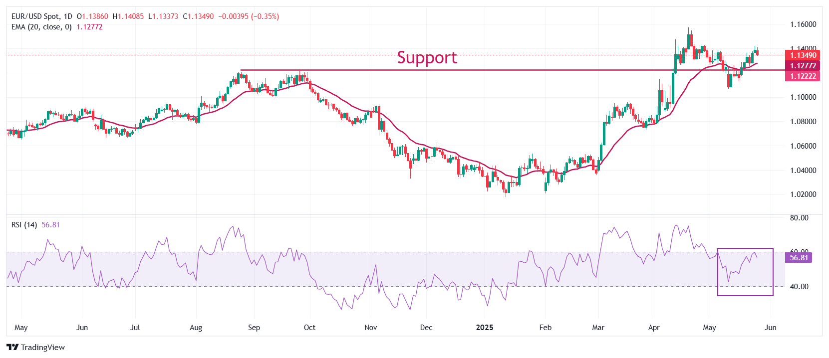 EUR/USD pulled back to around 1.1350 during Tuesday’s European trading session after reaching a monthly high of 1.1425 the previous day. The currency pair came under selling pressure as the US Dollar (USD) strengthened amid progress toward a potential trade deal between the United States (US) and the European Union (EU).