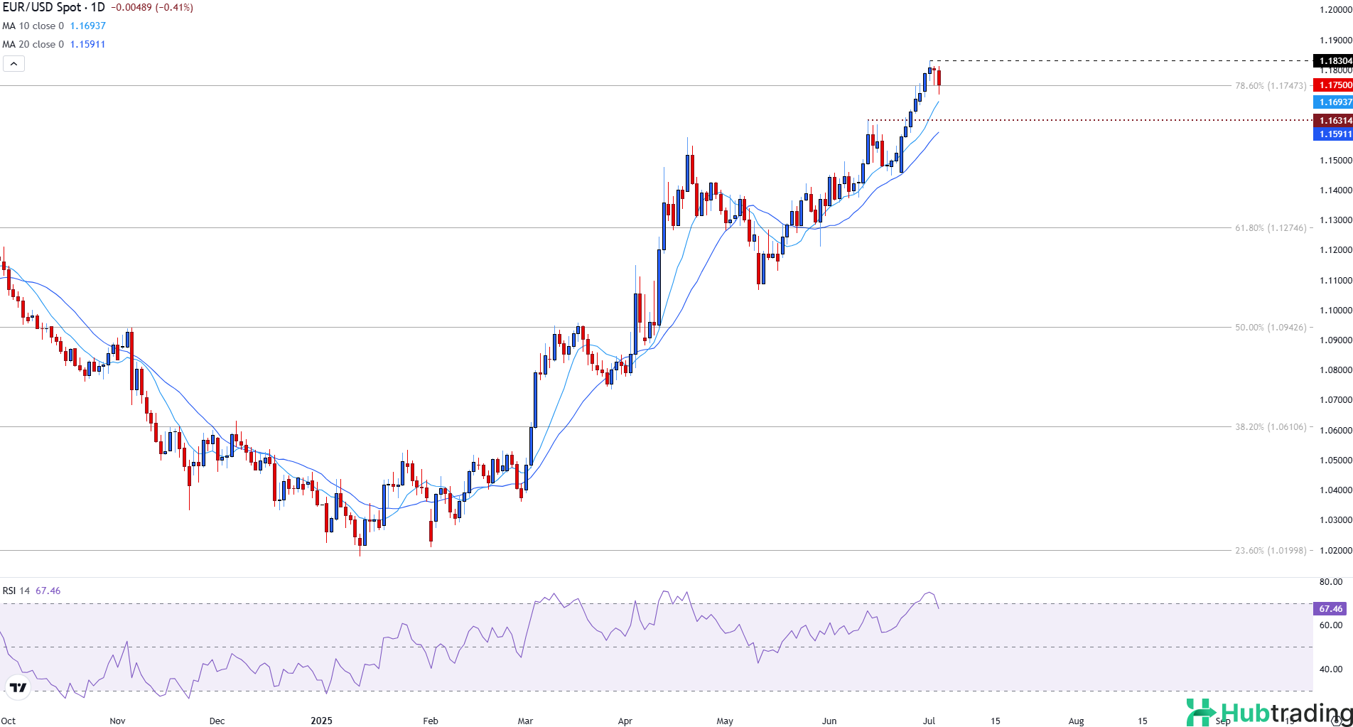 The EUR/USD pair recently demonstrated strong bullish momentum, rallying to a high of 1.1830. However, the move triggered profit-taking, with the pair now pulling back below the key psychological resistance at 1.1800.