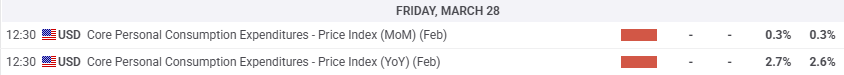 The market’s next key focus is the US Core Personal Consumption Expenditures (PCE) Price Index, set for release on Friday. Investors hope that recent inflation upticks are temporary, but expectations suggest an annualized rise to 2.7% YoY in February.